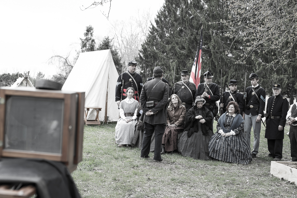 Re-enactment camp by the pondBeehive oven in Summer KitchenWood workers and reed workersKitchen table in the main houseTintype picture: re-enactors by the pondInside Wagonhouse A